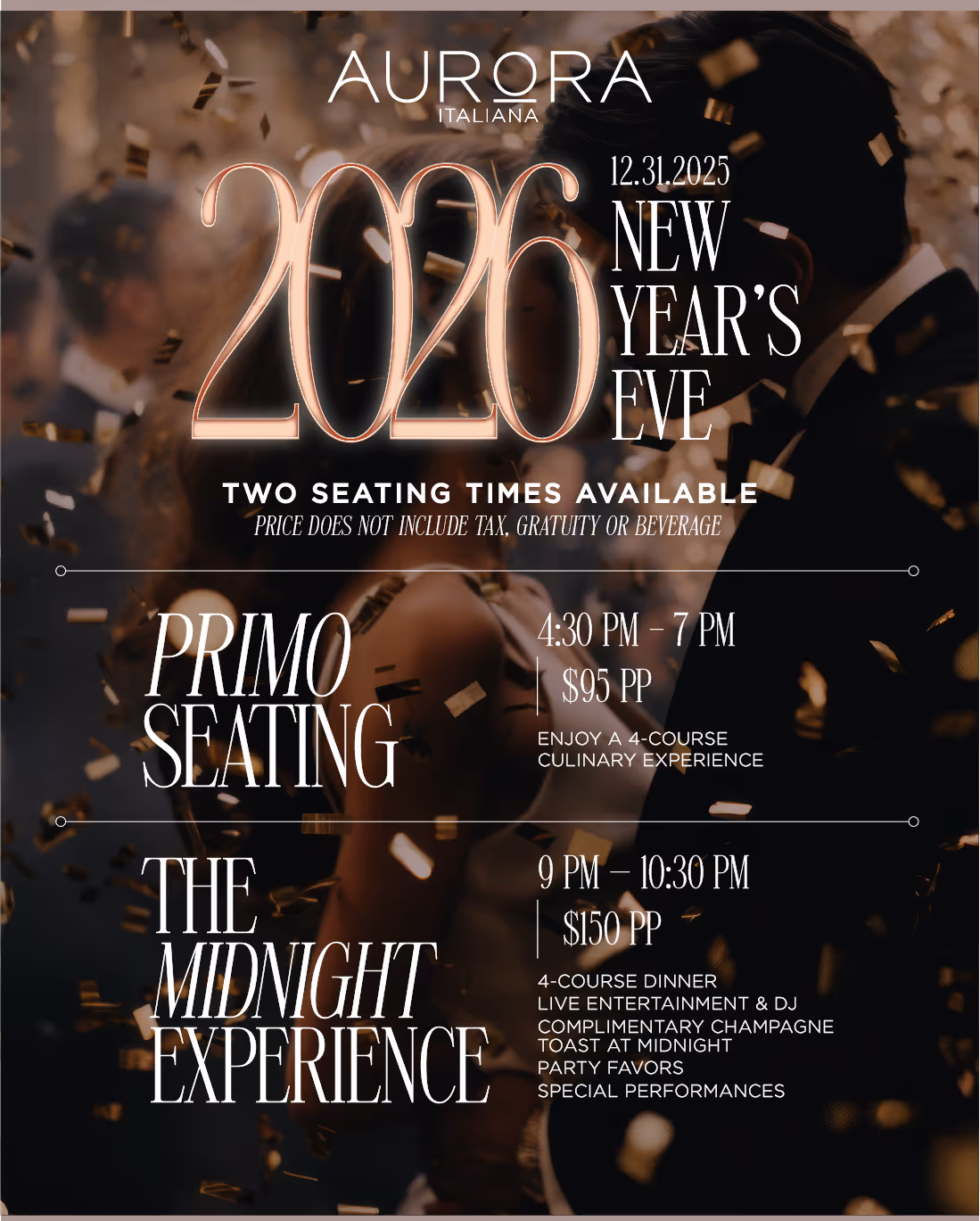 $150 per person (plus beverage, tax, and gratuity)Live entertainment | Complimentary champagne toast at midnight | Party favors | Special performances